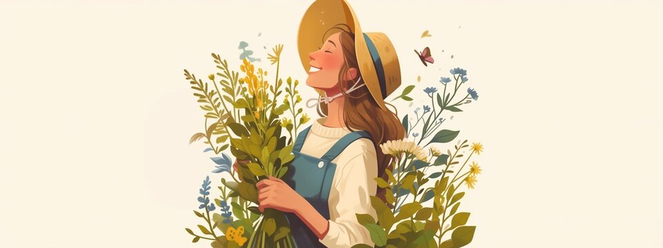 women with an armful of flowers, smiling, summer mood, illustration in banner format with space for text