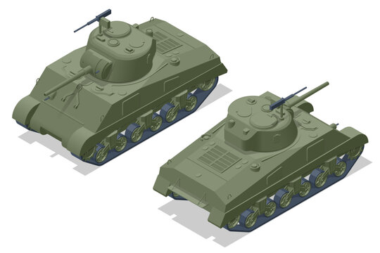 Isometric USA Medium Tank M4 Sherman. Armoured fighting vehicle designed for front-line combat, with heavy firepower