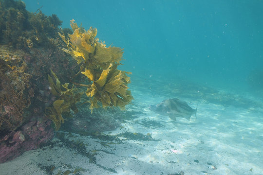 Shy giant boarfish Paristiopterus labiosus above white sand next to flat kelp covered rocky reef.