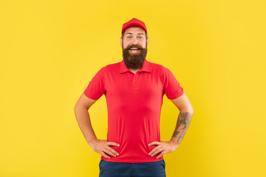 Happy bearded man in casual red cap and tshirt standing with tattooed arms akimbo yellow background, guy