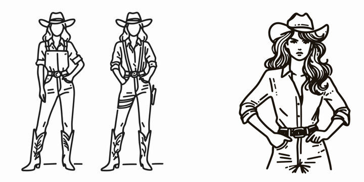 Cowgirl Standing with hands on hips. Western cowgirl Outline Clipart line art doodle vector illustration. Ranch woman posing arms akimbo vogue country persona equilibrium.