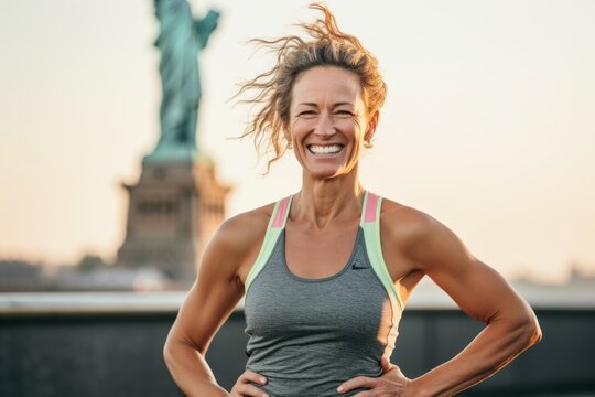 Portrait of a happy fitness woman standing with arms akimbo outdoors