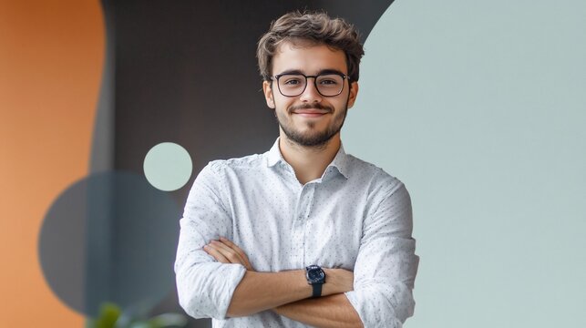 Portrait of a man with glasses and a white patterned shirt, arms crossed against a modern backdrop