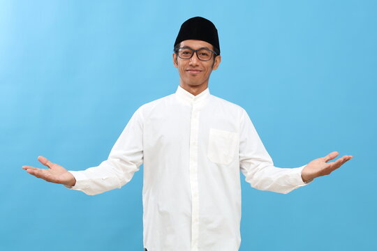 Asian muslim man smiling happy to greeting during Ramadan celebration with both arms open over blue background