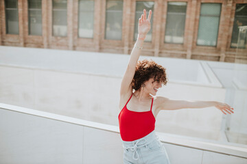 Cheerful woman with arms raised dancing by retaining wall in city