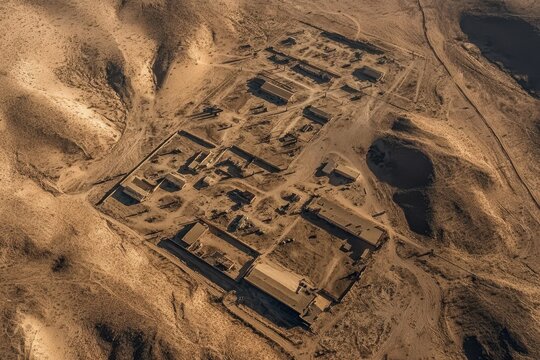 Exploring the remnants of an abandoned army camp in a desert landscape, An aerial view over an abandoned and deserted army compound