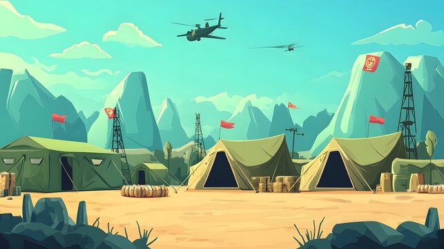 Military base with soldiers, helicopters, tanks, tents, storage buildings, trucks. Army training. Fighters. Military neutral uniform. Flat vector illustration.