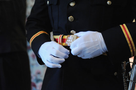A military groom adjusts his uniform before his wedding on July 20, 2012 in Frederick, Maryland.