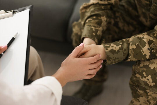 bearded army medic pressing hand on wounded limb with serious expression among soldiers