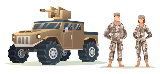 Man and woman army soldier characters with military vehicle cartoon illustration