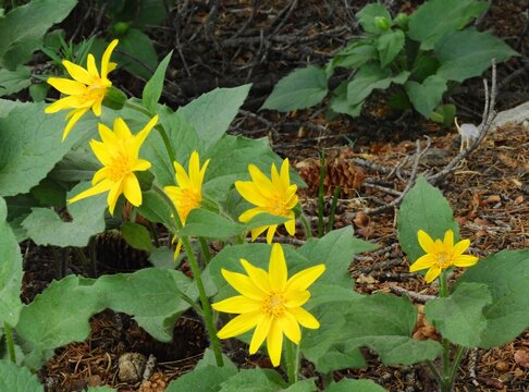 pretty yellow heartleaf arnica  wildflowers in the forest  in summer along the trail to blue lake  in the indian peaks wilderness area near nederland, colorado