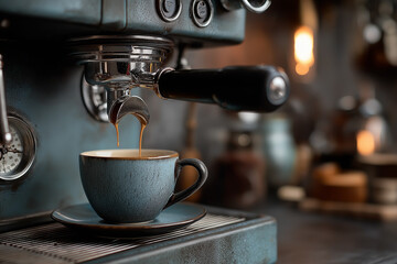 Fresh Espresso Pouring from Coffee Machine into Ceramic Cup in Cozy Café Setting.