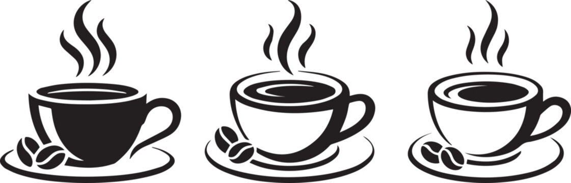 Coffee Cup Silhouette Set with Steam and Coffee Beans on Saucer