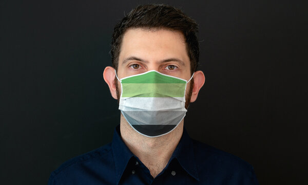 Portrait of an adult man wearing a LGBT aromantic flag colors facial mask. LGBT gay rights concept with black background. These colors symbolize the aromantic flag.