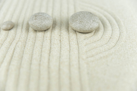 Zen sand garden meditation stone background. Balanced Stones and lines drawing in sand for relaxation. Concept of harmony, balance and meditation, spa, massage, relax.