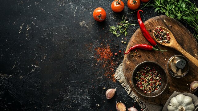 Culinary Herbs and Spices Border for Food Bloggers and Chefs Overhead View of Fresh Basil Garlic Peppercorns Chili Peppers and Tomatoes on Black Background
