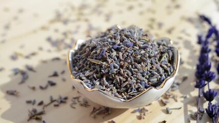 Porcelain bowl with lavender flowers spinning around on wooden table. Dry ingredient rotates close up video