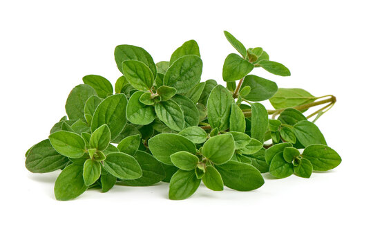 Sweet marjoram herb, fresh condiments, isolated on white background.