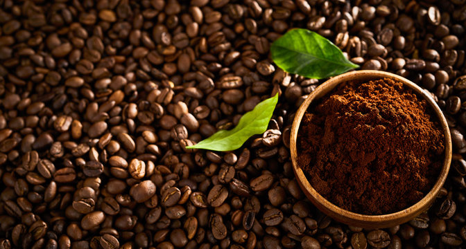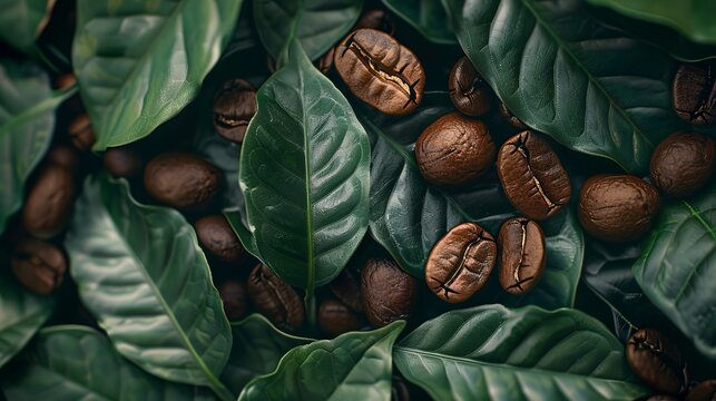 Close up of coffee bean background with leaves, top view. Photorealistic high resolution macro photography for advertising or food design.