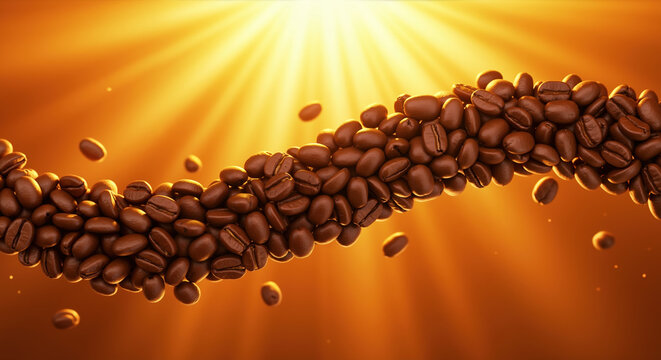 Flowing stream of coffee beans against golden radiant background with sunbeams. Dynamic composition of roasted coffee in motion for premium coffee advertising and energy drink promotions