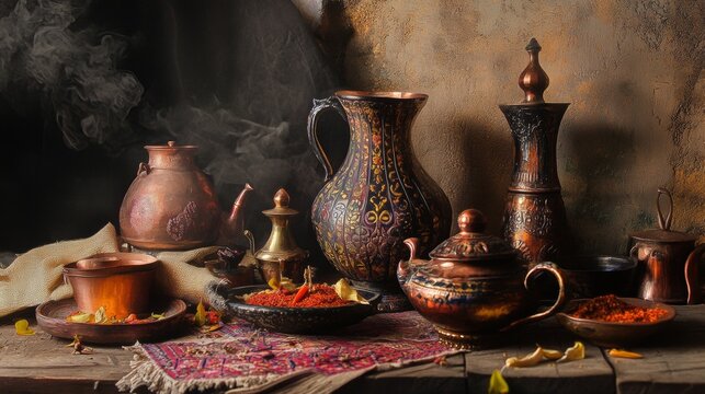 An inviting breakfast table set with an assortment of colorful dishes, fresh fruits, and aromatic beverages, all captured in warm, inviting lighting to create a cozy and appealing atmosphere for a