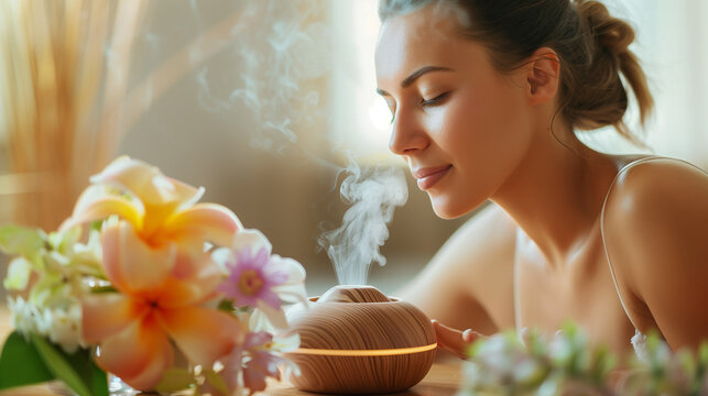 A calming image of a woman enjoying aromatherapy, inhaling soothing steam from a diffuser, surrounded by colorful flowers, with a soft background light.