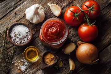 Top-down photo of homemade tomato ketchup with tomatoes and aromatics arranged for recipe styling