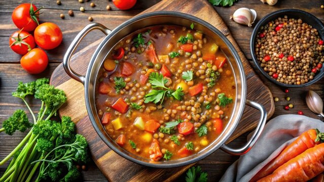 Simmering lentil soup in a large pot on the stovetop with vegetables and aromatic spices, pot, aromatics,  pot, aromatics