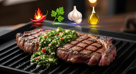 Gourmet grilled ribeye steak with chimichurri and aromatics