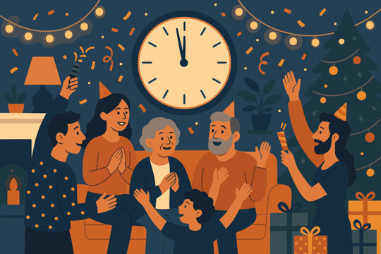 Year midnight new creating confetti illustration around ready lights countdown clock festive