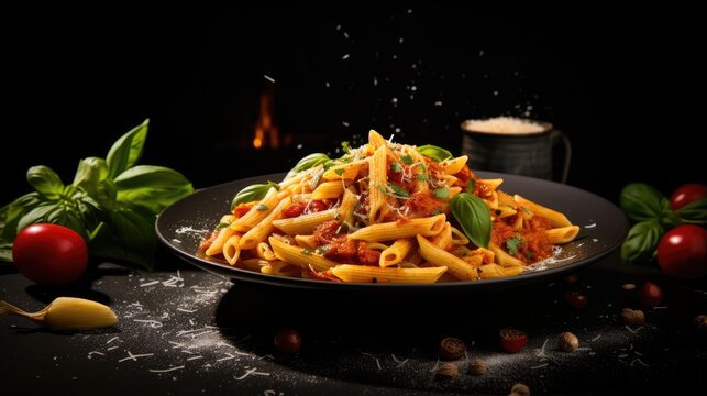 Italian penne alla arrabiata with basil grated parmesan on dark table Spicy penne pasta arrabbiata with cheese and basil