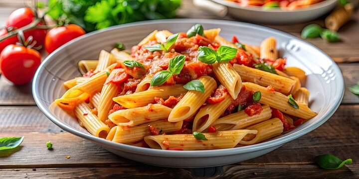 A close-up photo of a delicious and spicy Penne Arrabbiata pasta dish, penne, arrabbiata, pasta, spicy, tomato sauce, Italian