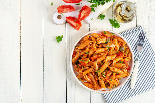 Classic italian pasta penne arrabbiata with vegetables on white wooden table. Penne pasta with sauce arrabbiata. Top view, overhead