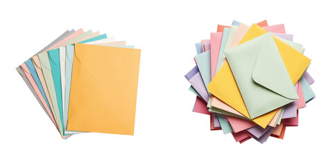 Close up detailed top view of a variety of multicolored envelopes arranged together on a transparent background, showcasing different colors and sizes of envelopes.