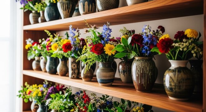 Flower-filled ceramic vases arrayed across wooden shelves, bright and colorful