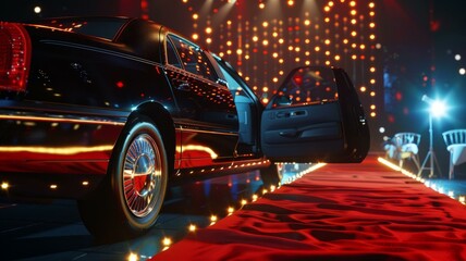 Luxury limousine arriving on red carpet at glamorous event with sparkling lights and VIP treatment