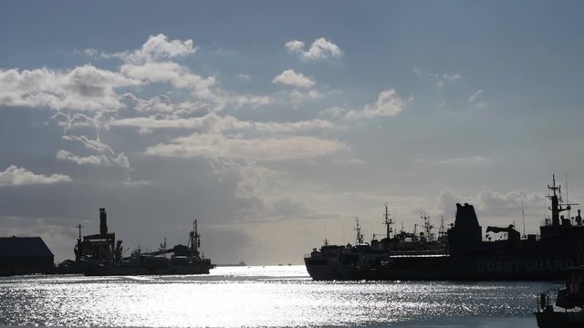 MAURITIUS, MAY 22, 2017. Black silhouettes of cargo ships arriving at Port Louis, in Mauritius on May 22nd 2017.