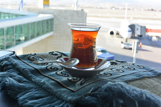 Istanbul / Turkey - 02.23.2017 : Black tea in a traditional glass glass on the background of the city's airport