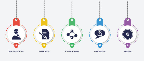 infographic element template with mail filled icons such as male reporter, paper note, social normal, chat group, arroba vector.