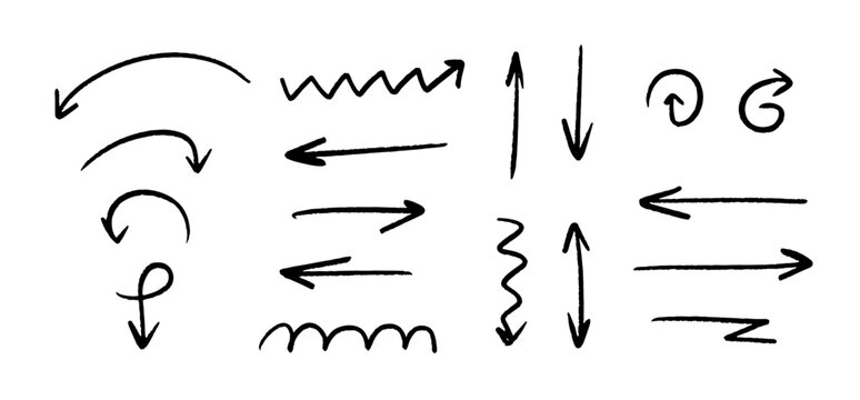 Hand drawn wavy and zigzag arrow set. Black grunge sketch arrow collection. Doodle sketched pointers and direction lines. Curved and straight brush stroke bundle for flyer, poster, brochure. Vector
