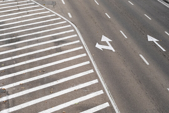 Curved highway lanes with directional arrows and clear road markings in an urban setting.