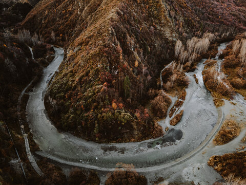 Aerial cinematic view over Arrowtown, New Zealands prime autumn destination