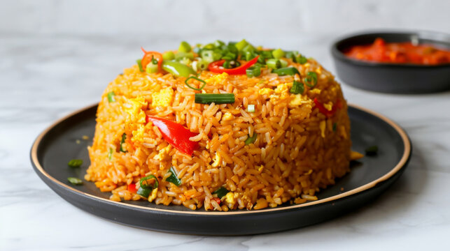 Authentic peruvian arroz chaufa served on a black plate with fresh garnishes against a neutral background, perfect for cuisine themes