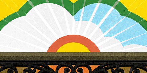 A sun is shining on a building with a green and white design