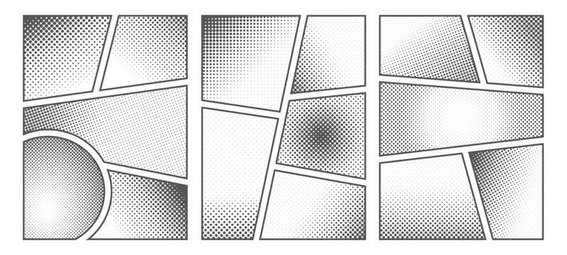Set of white and black halftone comic manga book template screentone page. Pop art halftone frame background with dot effects. Vector cartoon illustration
