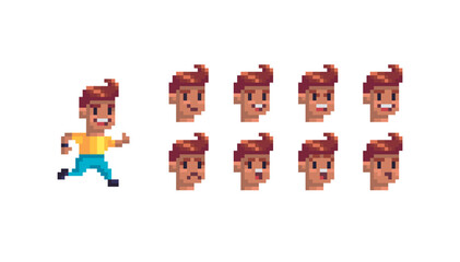 Set of character selection for playing game, man and women, things and symbols. Pixel art illustration on green landscape and cloudy sky with trees vector