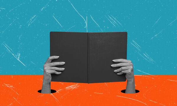 The human desire for knowledge. Hands holding open book. Modern art collage.