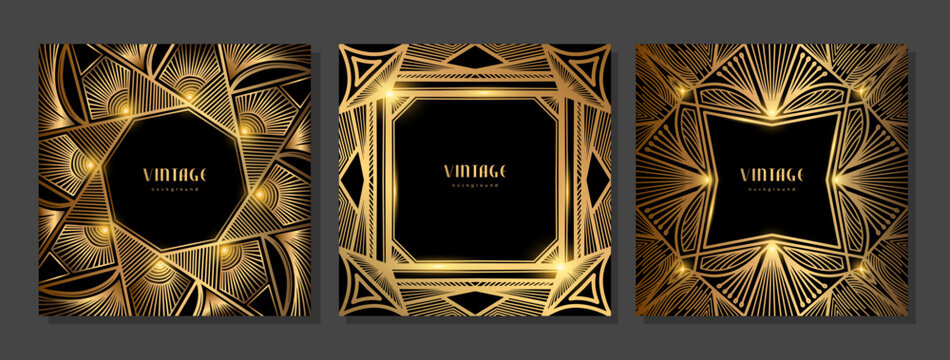 Set of luxury geometric linear template. Golden vintage frame. Art deco style gold background for banner, poster, cover. Retro line art with glitter, shine. Abstract minimalist gatsby style pattern