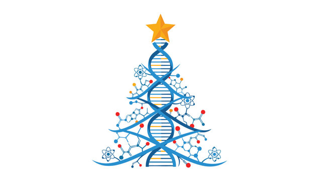 Festive DNA Christmas tree with molecules and golden star for science holiday celebrations and educational resources during winter season