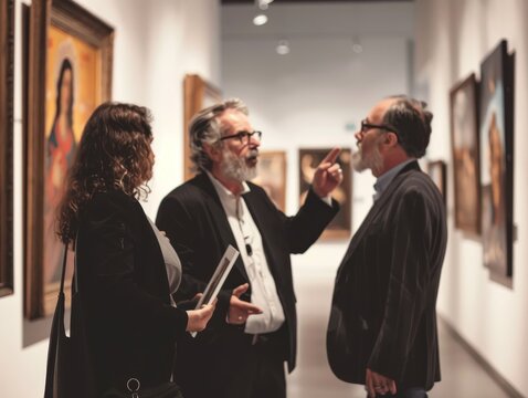 An art dealer and collector examining a painting in a gallery, detailed expressions